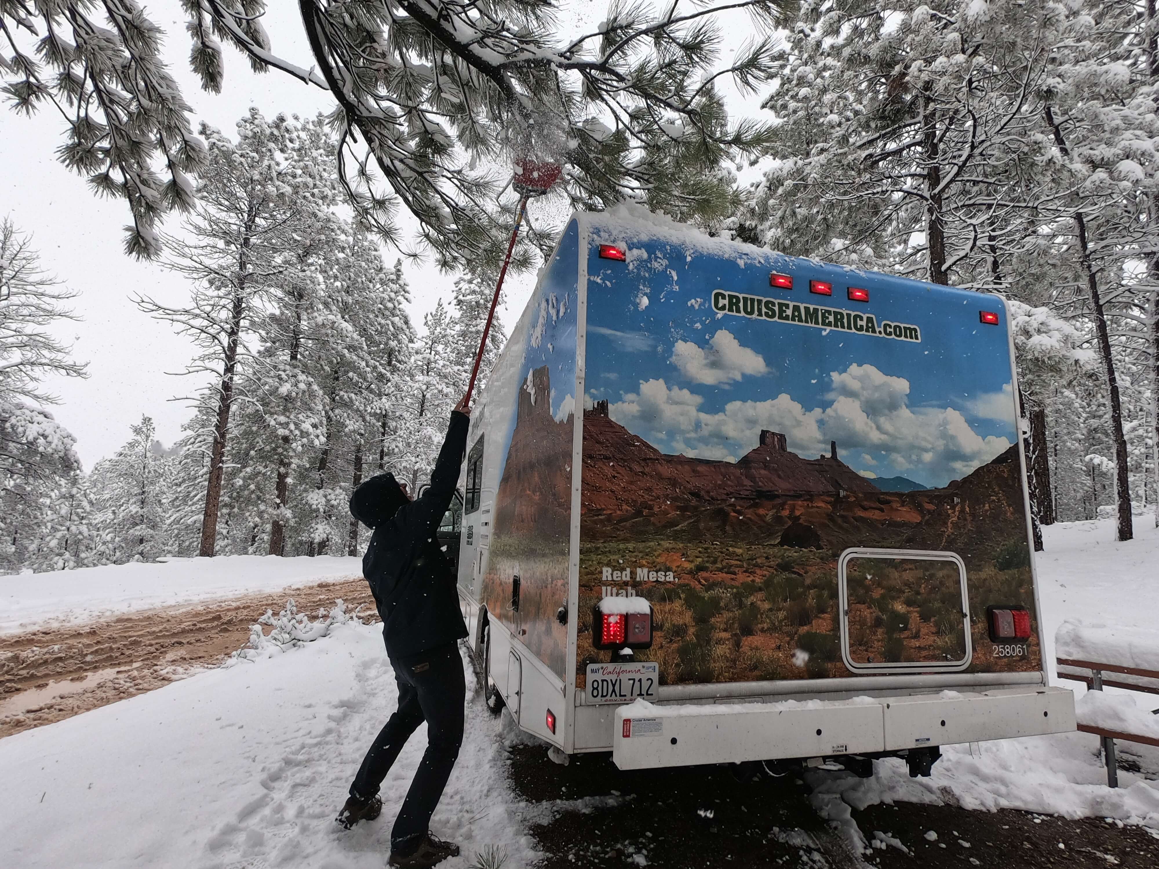 Heute geht es über mehrere Bergpässe (teilweise bis über 12.000 Fuß) in Richtung Rocky Mountains NP. Die Straßen sind eine Zumutung, vor allem dort, wo LKW im Winter üblicherweise Schneeketten anlegen. Zu unserem Pech hat sich der Starkregen von vor ein paar Tagen in den Hochlagen als Schnee auf die Straßen gelegt und die Eröffnung der Ridge Trail Road wurde wegen Unpassierbarkeit bis auf weiteres verschoben. Das heißt für uns: weitere 100 km Umweg.