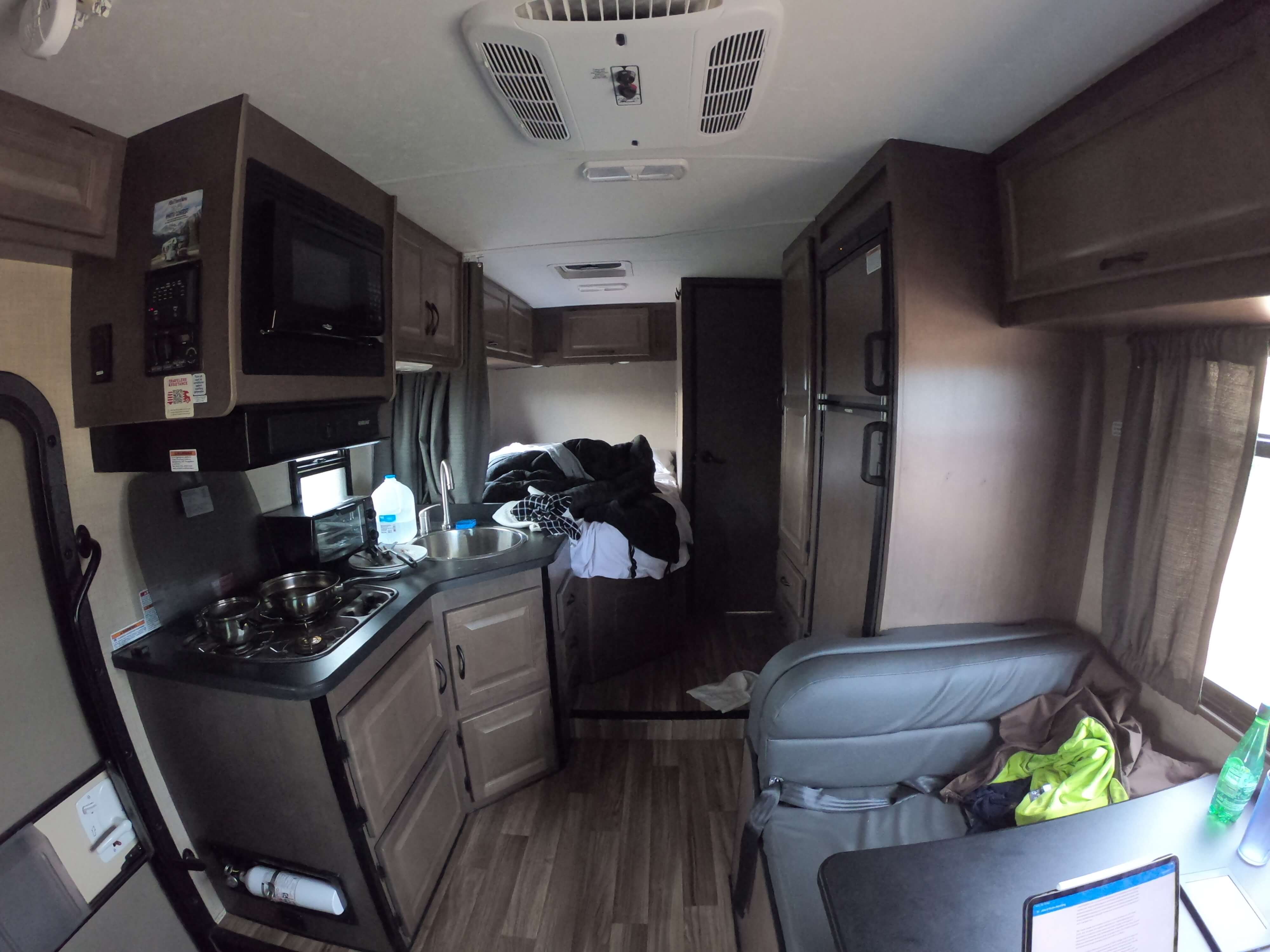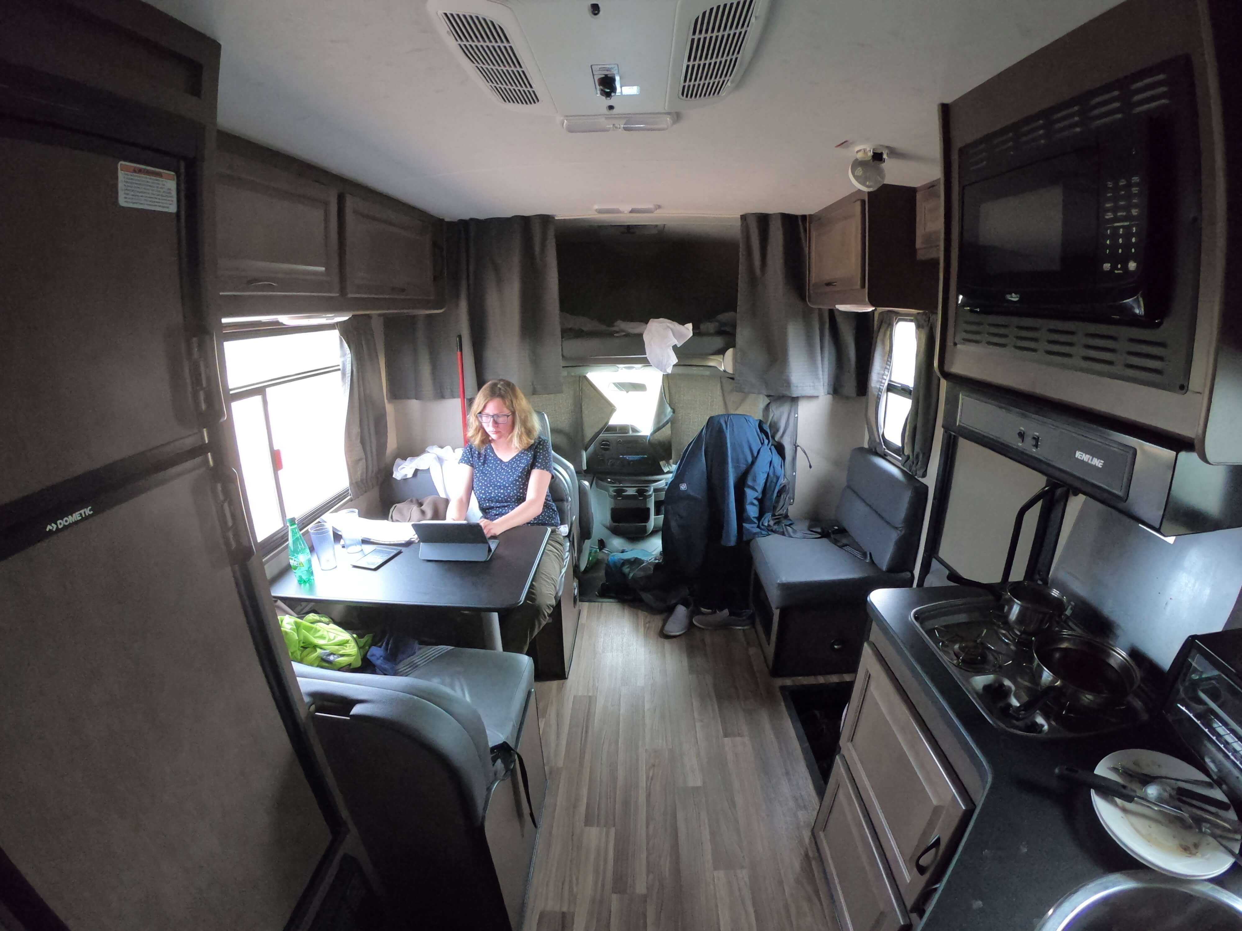 Von unserem Stellplatz aus kann man durch die Bäume in der Ferne die Wapitis grasen sehen. Wir genehmigen uns ein Mittagessen und fahren dann zum Discovery Center. Da es schon später Nachmittag ist, lohnt sich keine Wanderung mehr, aber wir decken uns mit Kartenmaterial ein uns planen die (Anfänger-)Wanderungen für morgen. Dann gehen wir uns im Obergeschoss die wie immer aufwändig installierten Infoboxen mit Exponaten und interaktiven Kinderlernstationen ansehen. Kevin ist beim Ausprobieren der verschiedenen Hebel und Klappen ganz in seinem Element. Ansonsten ist auch heute kein ereignisreicher Tag, aber das könnte sich ja morgen wieder ändern. 😉