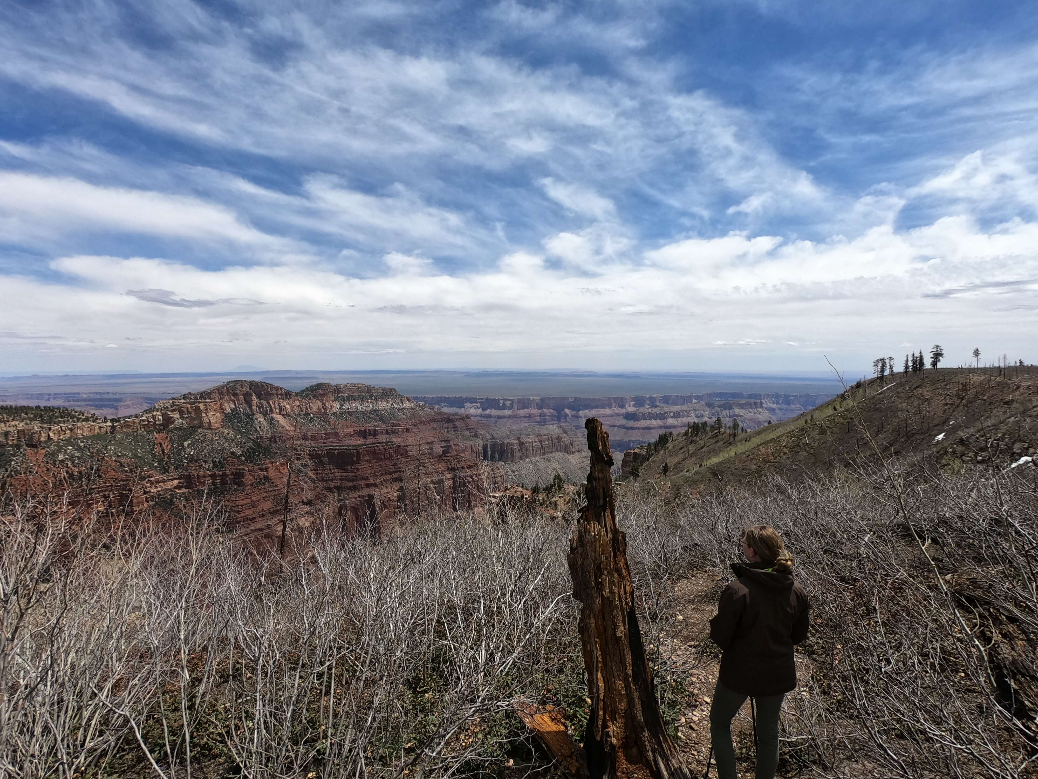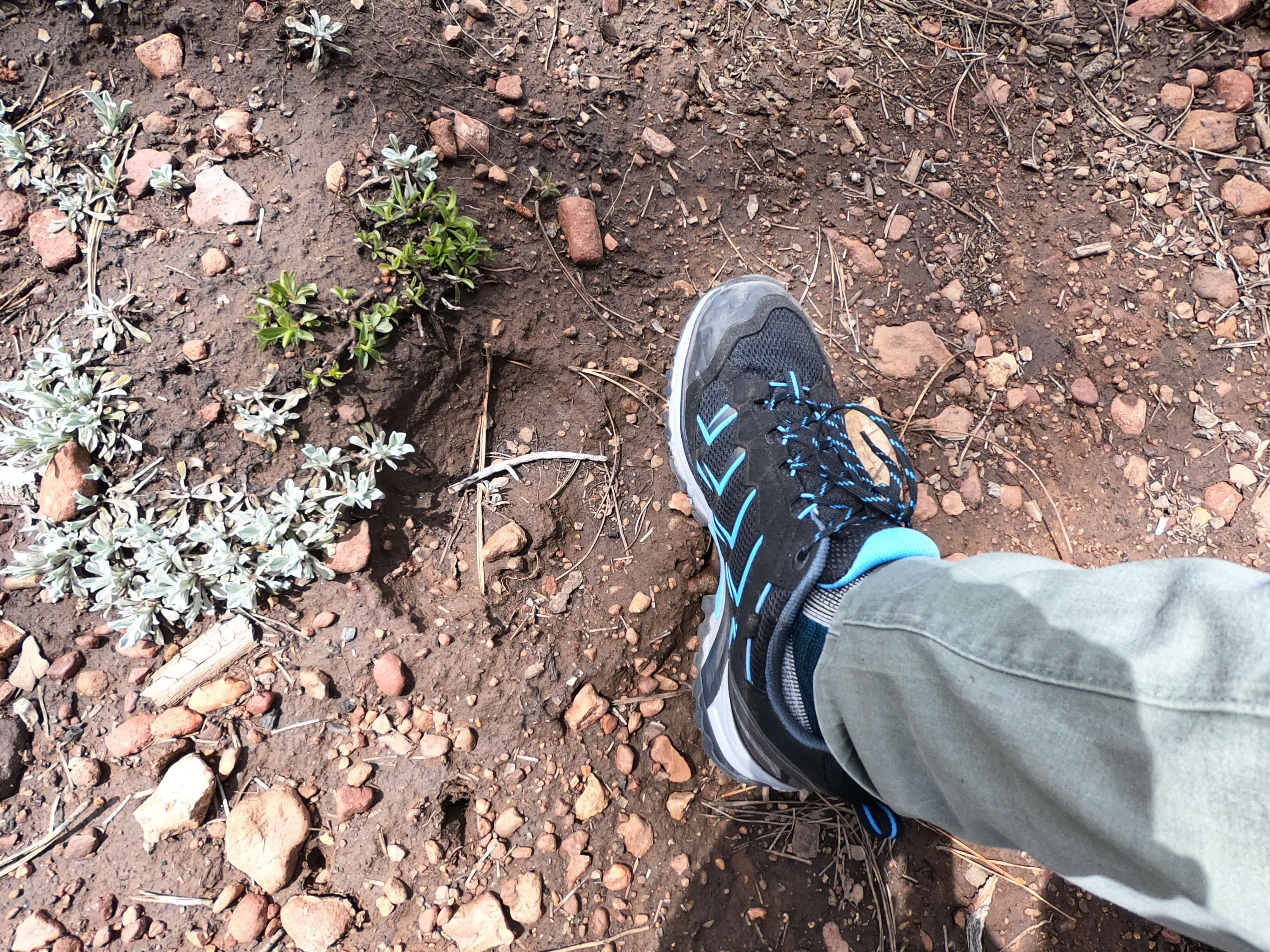 Heute wollen wir zum Cape Royal, einem etwas abgelegeneren Aussichtspunkt im Grand Canyon National Park. Leider ist die Zufahrtsstraße dorthin noch wegen Sanierungsarbeiten gesperrt, also fahren wir weiter zum Point Imperial. Dort angekommen entschließen wir uns, den Imperial Trail zu laufen. Dieser liegt abseits vom üblichen Touristentrubel und wir wandern diesen Trampelpfad praktisch allein. Unterwegs stoßen wir auf eine Reihe von Fußspuren und Haufen. Wir vermuten, es handelt sich neben recht offensichtlichen Hirschspuren um die riesigen Hufabdrücke von Bisons.